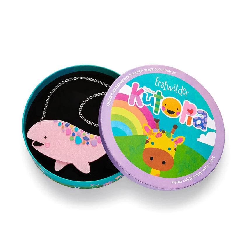 This Erstwilder x Kasey Rainbow Winnie the Whale Necklace has been hand-assembled from a combination of colourful resins and finished with hand-painted details. A resident of the wonderful world of Kutopia, Winnie is always awash with ideas. Wear her with her matching brooch whether you’ve got a plan for the day or happy to see where it takes you.